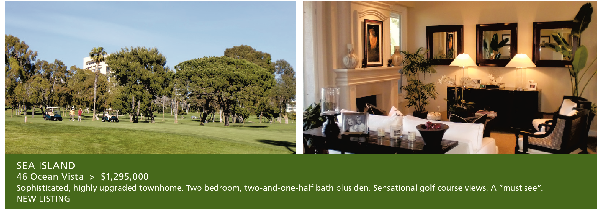 SEA ISLAND 46 Ocean Vista > $1,295,000 Sophisticated, highly upgraded townhome. Two bedroom, two-and-one-half bath plus den. Sensational golf course views. A “must see”. NEW LISTING