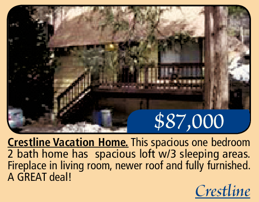 Crestline Vacation Home. This spacious one bedroom 2 bath home has spacious loft w/3 sleeping areas. Fireplace in living room, newer roof and fully furnished. A GREAT deal!