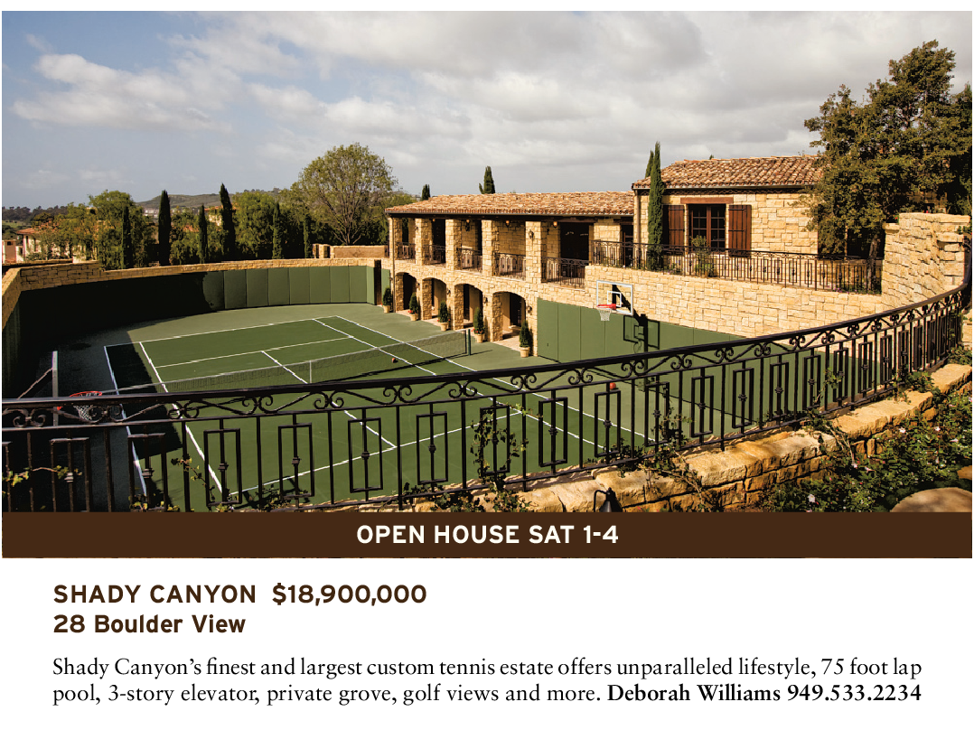 Shady Canyon’s finest and largest custom tennis estate offers unparalleled lifestyle, 75 foot lap pool, 3-story elevator, private grove, golf views and more. Deborah Williams 949.533.2234