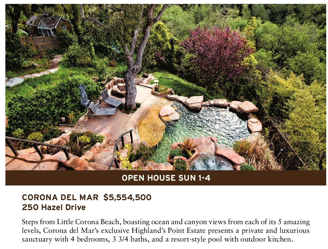 CORONA DEL MAR $5,554,500 250 Hazel Drive OPEN HOUSE SUN 1-4 Steps from Little Corona Beach, boasting ocean and canyon views from each of its 5 amazing levels, Corona del Mar’s exclusive Highland’s Point Estate presents a private and luxurious sanctuary with 4 bedrooms, 3 3/4 baths, and a resort-style pool with outdoor kitchen.