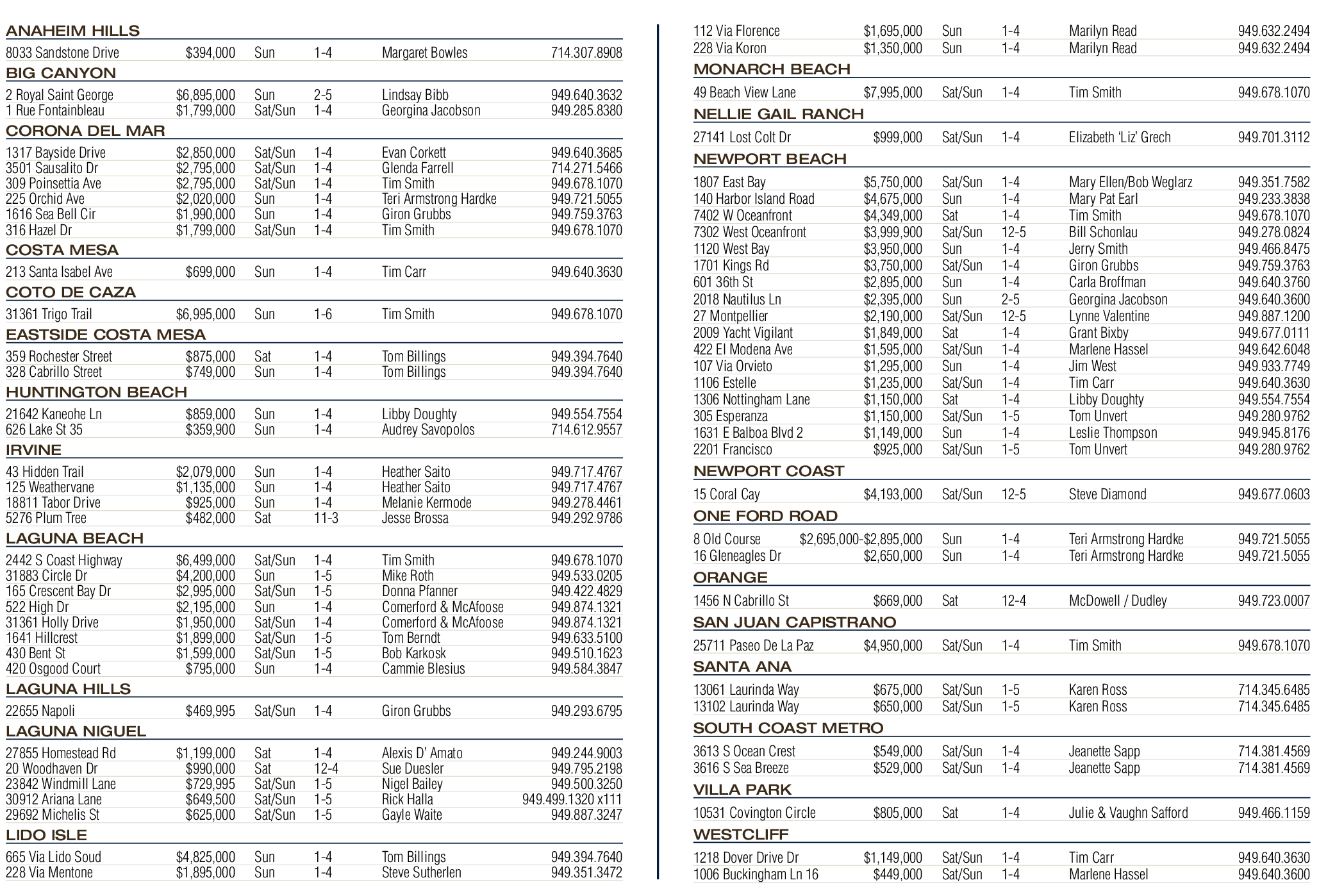 2 Royal Saint George $6,895,000 Sun 2-5 Lindsay Bibb 949.640.3632 1 Rue Fontainbleau $1,799,000 Sat/Sun 1-4 Georgina Jacobson 949.285.8380 CORONA DEL MAR 1317 Bayside Drive $2,850,000 Sat/Sun 1-4 Evan Corkett 949.640.3685 3501 Sausalito Dr $2,795,000 Sat/Sun 1-4 Glenda Farrell 714.271.5466 309 Poinsettia Ave $2,795,000 Sat/Sun 1-4 Tim Smith 949.678.1070 225 Orchid Ave $2,020,000 Sun 1-4 Teri Armstrong Hardke 949.721.5055 1616 Sea Bell Cir $1,990,000 Sun 1-4 Giron Grubbs 949.759.3763 316 Hazel Dr $1,799,000 Sat/Sun 1-4 Tim Smith 949.678.1070 COSTA MESA 213 Santa Isabel Ave $699,000 Sun 1-4 Tim Carr 949.640.3630 COTO DE CAZA 31361 Trigo Trail $6,995,000 Sun 1-6 Tim Smith 949.678.1070 EASTSIDE COSTA MESA 359 Rochester Street $875,000 Sat 1-4 Tom Billings 949.394.7640 328 Cabrillo Street $749,000 Sun 1-4 Tom Billings 949.394.7640 HUNTINGTON BEACH 21642 Kaneohe Ln $859,000 Sun 1-4 Libby Doughty 949.554.7554 626 Lake St 35 $359,900 Sun 1-4 Audrey Savopolos 714.612.9557 IRVINE 43 Hidden Trail $2,079,000 Sun 1-4 Heather Saito 949.717.4767 125 Weathervane $1,135,000 Sun 1-4 Heather Saito 949.717.4767 18811 Tabor Drive $925,000 Sun 1-4 Melanie Kermode 949.278.4461 5276 Plum Tree $482,000 Sat 11-3 Jesse Brossa 949.292.9786 LAGUNA BEACH 2442 S Coast Highway $6,499,000 Sat/Sun 1-4 Tim Smith 949.678.1070 31883 Circle Dr $4,200,000 Sun 1-5 Mike Roth 949.533.0205 165 Crescent Bay Dr $2,995,000 Sat/Sun 1-5 Donna Pfanner 949.422.4829 522 High Dr $2,195,000 Sun 1-4 Comerford & McAfoose 949.874.1321 31361 Holly Drive $1,950,000 Sat/Sun 1-4 Comerford & McAfoose 949.874.1321 1641 Hillcrest $1,899,000 Sat/Sun 1-5 Tom Berndt 949.633.5100 430 Bent St $1,599,000 Sat/Sun 1-5 Bob Karkosk 949.510.1623 420 Osgood Court $795,000 Sun 1-4 Cammie Blesius 949.584.3847 LAGUNA HILLS 22655 Napoli $469,995 Sat/Sun 1-4 Giron Grubbs 949.293.6795 LAGUNA NIGUEL 27855 Homestead Rd $1,199,000 Sat 1-4 Alexis D’ Amato 949.244.9003 20 Woodhaven Dr $990,000 Sat 12-4 Sue Duesler 949.795.2198 23842 Windmill Lane $729,995 Sat/Sun 1-5 Nigel Bailey 949.500.3250 30912 Ariana Lane $649,500 Sat/Sun 1-5 Rick Halla 949.499.1320 x111 29692 Michelis St $625,000 Sat/Sun 1-5 Gayle Waite 949.887.3247 LIDO ISLE 665 Via Lido Soud $4,825,000 Sun 1-4 Tom Billings 949.394.7640 228 Via Mentone $1,895,000 Sun 1-4 Steve Sutherlen 949.351.3472