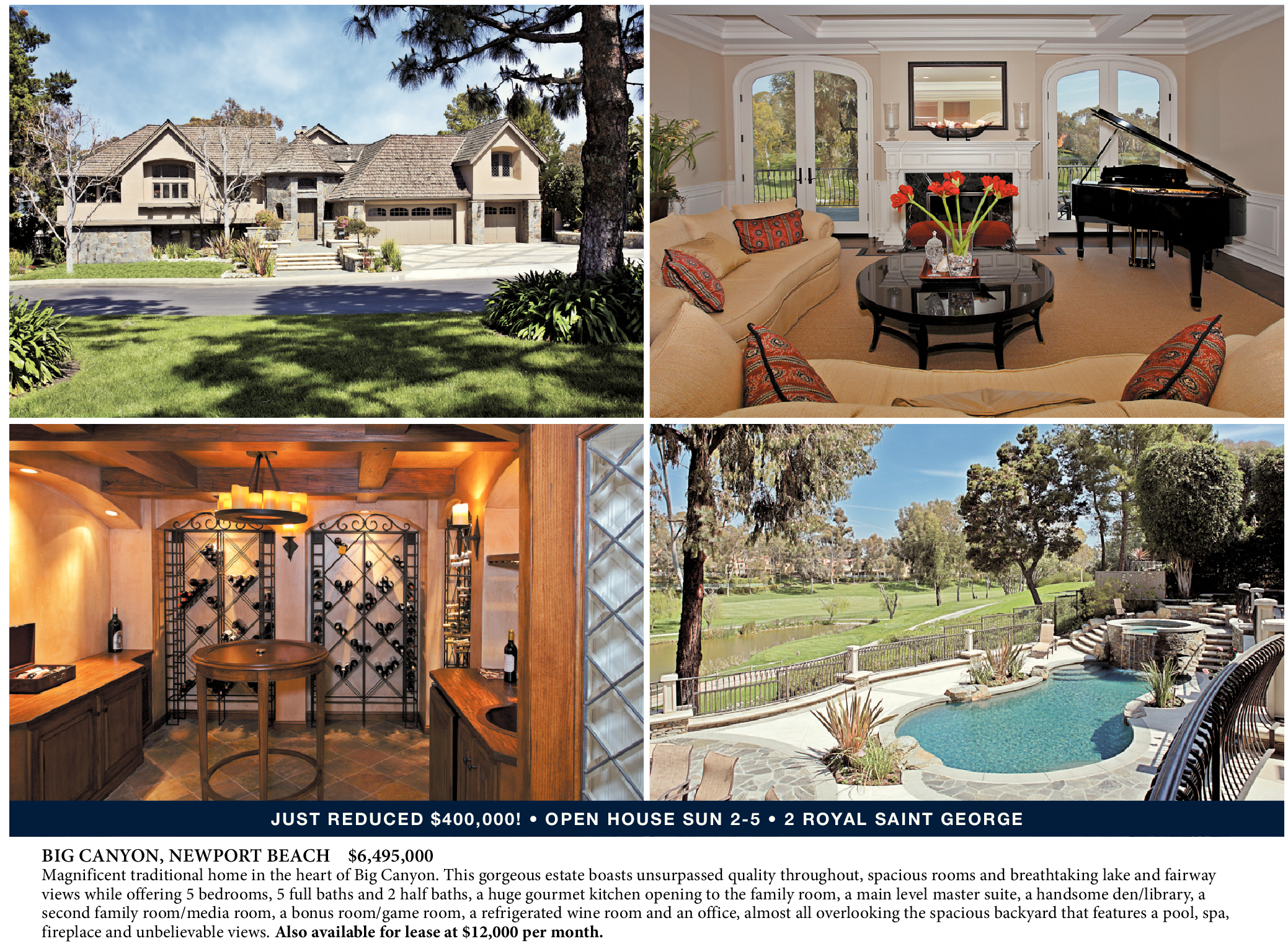 BIG CANYON, NEWPORT BEACH $6,495,000 Magnificent traditional home in the heart of Big Canyon. This gorgeous estate boasts unsurpassed quality throughout, spacious rooms and breathtaking lake and fairway views while offering 5 bedrooms, 5 full baths and 2 half baths, a huge gourmet kitchen opening to the family room, a main level master suite, a handsome den/library, a second family room/media room, a bonus room/game room, a refrigerated wine room and an office, almost all overlooking the spacious backyard that features a pool, spa, fireplace and unbelievable views. Also available for lease at $12,000 per month.