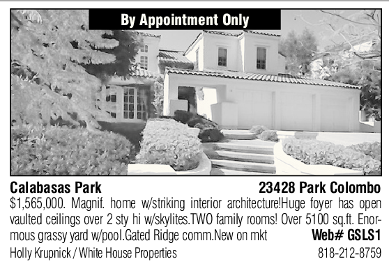 $1,565,000. Magnif. home w/striking interior architecture!Huge foyer has open vaulted ceilings over 2 sty hi w/skylites.TWO family rooms! Over 5100 sq.ft. Enormous grassy yard w/pool.Gated Ridge comm.New on mkt Web# GSLS1 Holly Krupnick / White House Properties 818-212-8759