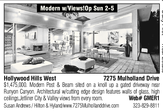 ceilings,Jetliner City & Valley views from every room. Web# GMER1 $1,475,000. Modern Post & Beam sited on a knoll up a gated driveway near Runyon Canyon. Architectural w/cutting edge design features walls of glass, high Susan Andrews / Hilton & Hyland/www.7275Mulhollanddrive.com 323-829-8811