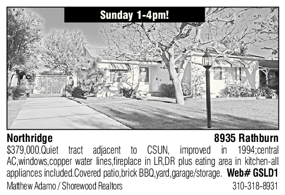 Northridge 8935 Rathburn $379,000.Quiet tract adjacent to CSUN, improved in 1994;central AC,windows,copper water lines,fireplace in LR,DR plus eating area in kitchen-all appliances included.Covered patio,brick BBQ,yard,garage/storage. Web# GSLD1 Matthew Adamo / Shorewood Realtors 310-318-8931
