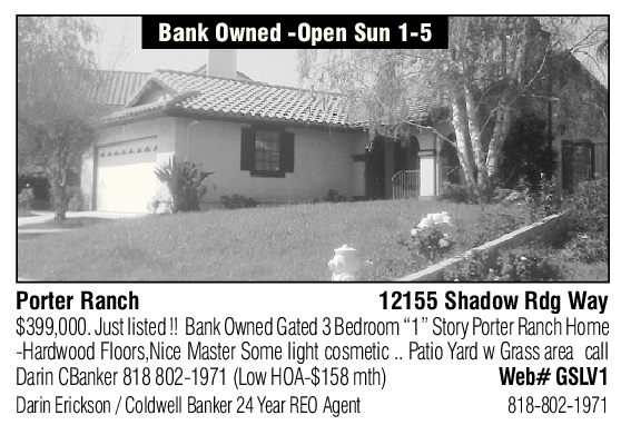 Porter Ranch 12155 Shadow Rdg Way $399,000. Just listed !! Bank Owned Gated 3 Bedroom “1” Story Porter Ranch Home -Hardwood Floors,Nice Master Some light cosmetic .. Patio Yard w Grass area call Darin CBanker 818 802-1971 (Low HOA-$158 mth) Web# GSLV1 Darin Erickson / Coldwell Banker 24 Year REO Agent 818-802-1971