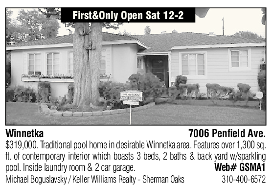 First&Only Open Sat 12-2 Winnetka 7006 Penfield Ave. $319,000. Traditional pool home in desirable Winnetka area. Features over 1,300 sq. ft. of contemporary interior which boasts 3 beds, 2 baths & back yard w/sparkling pool. Inside laundry room & 2 car garage. Web# GSMA1 Michael Boguslavsky / Keller Williams Realty - Sherman Oaks 310-400-6572