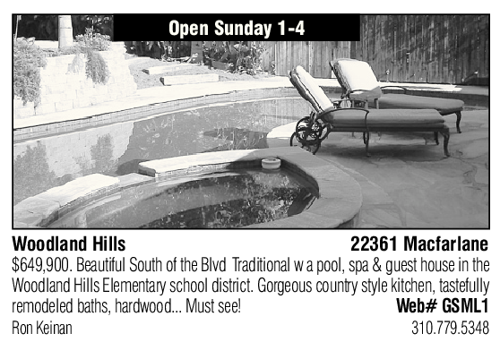 Woodland Hills 22361 Macfarlane $649,900. Beautiful South of the Blvd Traditional w a pool, spa & guest house in the Woodland Hills Elementary school district. Gorgeous country style kitchen, tastefully remodeled baths, hardwood... Must see! Web# GSML1 Ron Keinan 310.779.5348