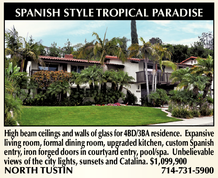 SPANISH STYLE TROPICAL PARADISE High beam ceilings and walls of glass for 4BD/3BA residence. Expansive living room, formal dining room, upgraded kitchen, custom Spanish entry, iron forged doors in courtyard entry, pool/spa. Unbelievable views of the city lights, sunsets and Catalina. $1,099,900 NORTH TUSTIN 714-731-5900
