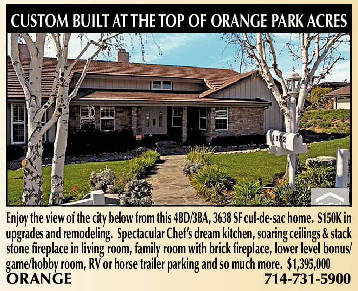 Enjoy the view of the city below from this 4BD/3BA, 3638 SF cul-de-sac home. $150K in upgrades and remodeling. Spectacular Chef’s dream kitchen, soaring ceilings & stack stone fireplace in living room, family room with brick fireplace, lower level bonus/ game/hobby room, RV or horse trailer parking and so much more. $1,395,000 ORANGE 714-731-5900