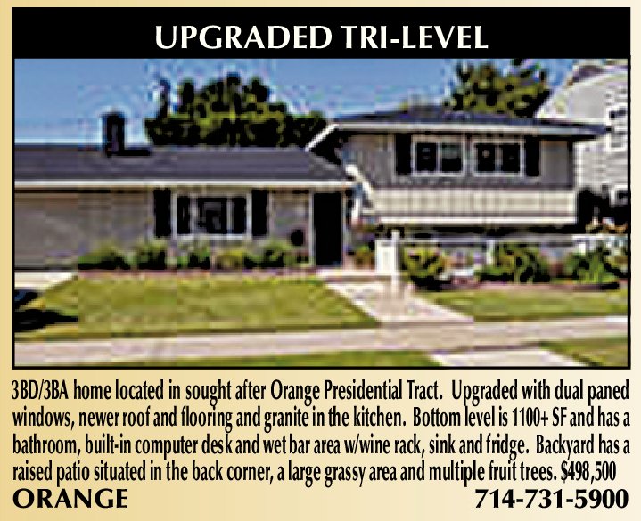 3BD/3BA home located in sought after Orange Presidential Tract. Upgraded with dual paned windows, newer roof and flooring and granite in the kitchen. Bottom level is 1100+ SF and has a bathroom, built-in computer desk and wet bar area w/wine rack, sink and fridge. Backyard has a raised patio situated in the back corner, a large grassy area and multiple fruit trees. $498,500 ORANGE 714-731-5900