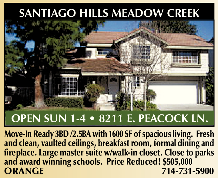 OPEN SUN 1-4 • 8211 E. PEACOCK LN. Move-In Ready 3BD /2.5BA with 1600 SF of spacious living. Fresh and clean, vaulted ceilings, breakfast room, formal dining and fireplace. Large master suite w/walk-in closet. Close to parks and award winning schools. Price Reduced! $505,000 ORANGE 714-731-5900 SANTIAGO HILLS MEADOW CREEK