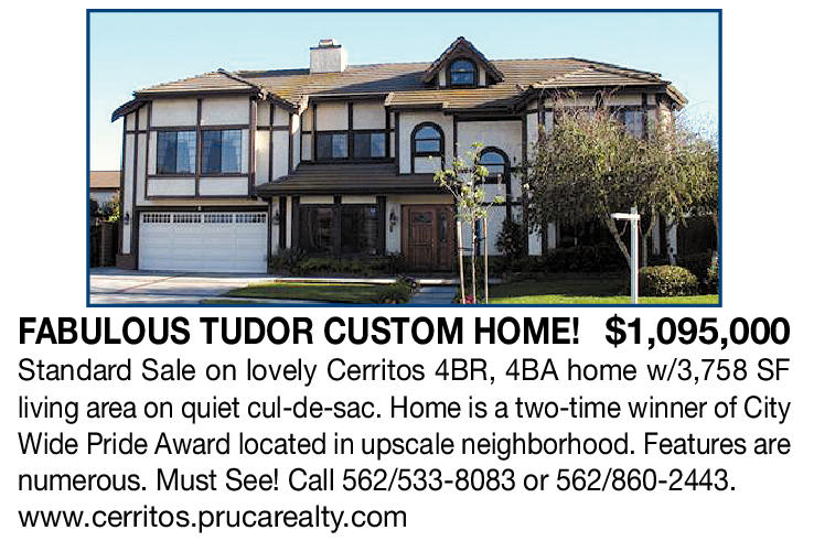FABULOUS TUDOR CUSTOM HOME! $1,095,000 Standard Sale on lovely Cerritos 4BR, 4BA home w/3,758 SF living area on quiet cul-de-sac. Home is a two-time winner of City Wide Pride Award located in upscale neighborhood. Features are numerous. Must See! Call 562/533-8083 or 562/860-2443. www.cerritos.prucarealty.com