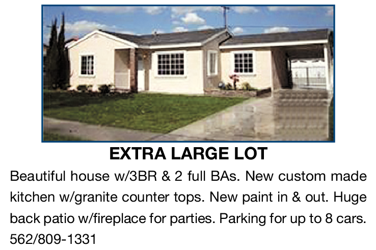 EXTRA LARGE LOT Beautiful house w/3BR & 2 full BAs. New custom made kitchen w/granite counter tops. New paint in & out. Huge back patio w/fireplace for parties. Parking for up to 8 cars. 562/809-1331