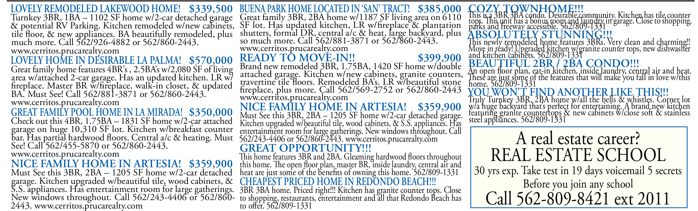BUENA PARK HOME LOCATED IN ‘SAN’ TRACT! $385,000 Great family 3BR, 2BA home w/1187 SF living area on 6110 SF lot. Has updated kitchen, LR w/fireplace & plantation shutters, formal DR, central a/c & heat, large backyard, plus so much more. Call 562/881-3871 or 562/860-2443. www.cerritos.prucarealty.com READY TO MOVE-IN!! $399,900 Brand new remodeled 3BR, 1.75BA, 1420 SF home w/double attached garage. Kitchen w/new cabinets, granite counters, travertine tile floors. Remodeled BA’s. LR w/beautiful stone fireplace, plus more. Call 562/569-2752 or 562/860-2443 www.cerritos.prucarealty.com NICE FAMILY HOME IN ARTESIA! $359,900 Must See this 3BR, 2BA – 1205 SF home w/2-car detached garage. Kitchen upgraded w/beautiful tile, wood cabinets, & S.S. appliances. Has entertainment room for large gatherings. New windows throughout. Call 562/243-4406 or 562/860-2443. www.cerritos.prucarealty.com GREAT OPPORTUNITY!!!