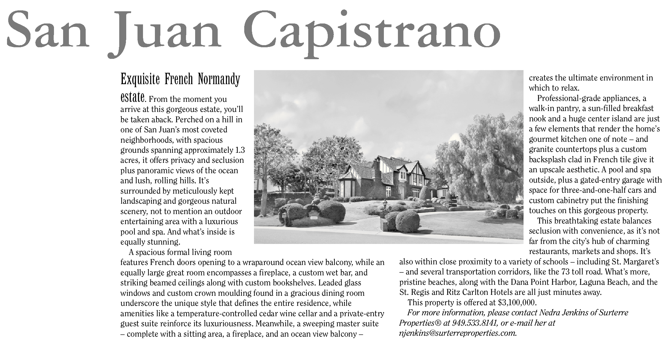 This property is offered at $3,100,000. For more information, please contact Nedra Jenkins of Surterre Properties® at 949.533.8141, or e-mail her at njenkins@surterreproperties.com.