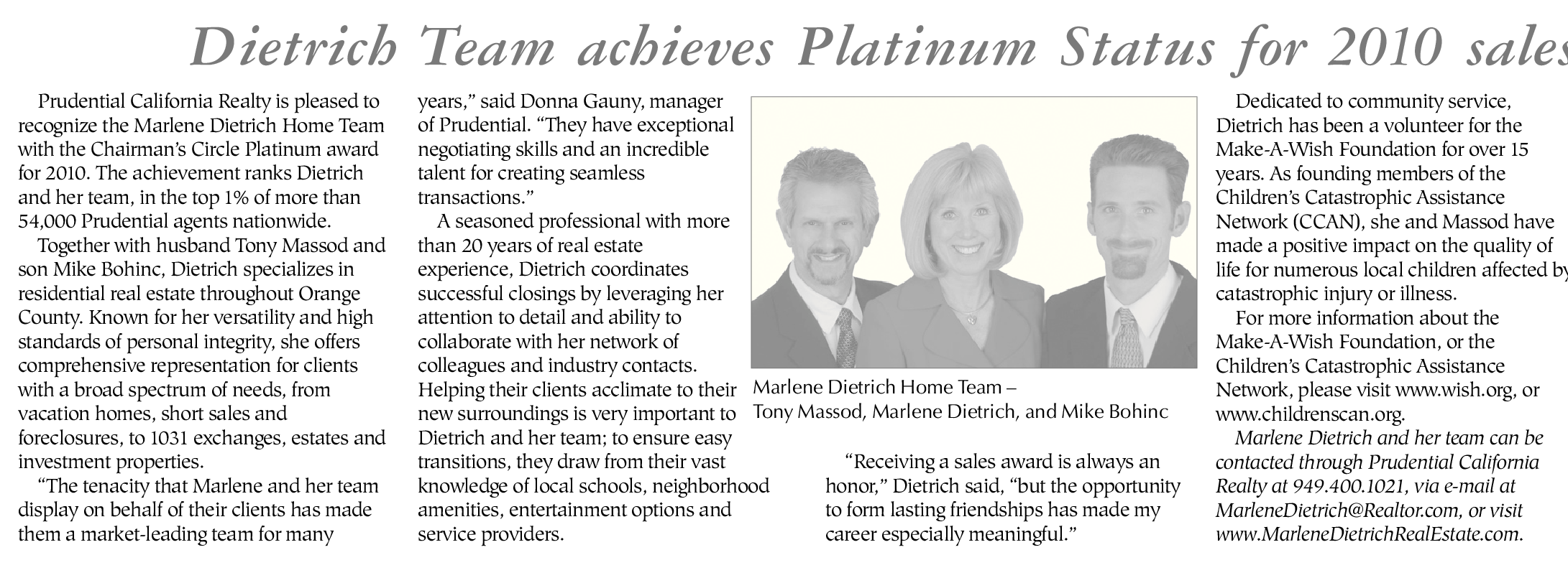 Prudential California Realty is pleased to recognize the Marlene Dietrich Home Team with the Chairman’s Circle Platinum award for 2010. The achievement ranks Dietrich and her team, in the top 1% of more than 54,000 Prudential agents nationwide.