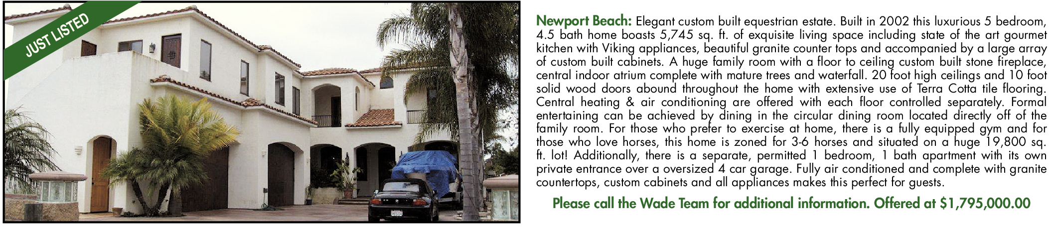 Newport Beach: Elegant custom built equestrian estate. Built in 2002 this luxurious 5 bedroom, 4.5 bath home boasts 5,745 sq. ft. of exquisite living space including state of the art gourmet kitchen with Viking appliances, beautiful granite counter tops and accompanied by a large array of custom built cabinets. A huge family room with a floor to ceiling custom built stone fireplace, central indoor atrium complete with mature trees and waterfall. 20 foot high ceilings and 10 foot solid wood doors abound throughout the home with extensive use of Terra Cotta tile flooring. Central heating & air conditioning are offered with each floor controlled separately. Formal entertaining can be achieved by dining in the circular dining room located directly off of the family room. For those who prefer to exercise at home, there is a fully equipped gym and for those who love horses, this home is zoned for 3-6 horses and situated on a huge 19,800 sq. ft. lot! Additionally, there is a separate, permitted 1 bedroom, 1 bath apartment with its own private entrance over a oversized 4 car garage. Fully air conditioned and complete with granite countertops, custom cabinets and all appliances makes this perfect for guests.