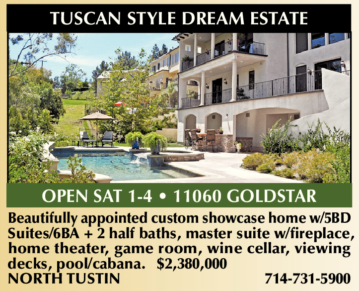 TUSCAN STYLE DREAM ESTATE OPEN SAT 1-4 • 11060 GOLDSTAR Beautifully appointed custom showcase home w/5BD Suites/6BA + 2 half baths, master suite w/fireplace, home theater, game room, wine cellar, viewing decks, pool/cabana. $2,380,000 NORTH TUSTIN 714-731-5900