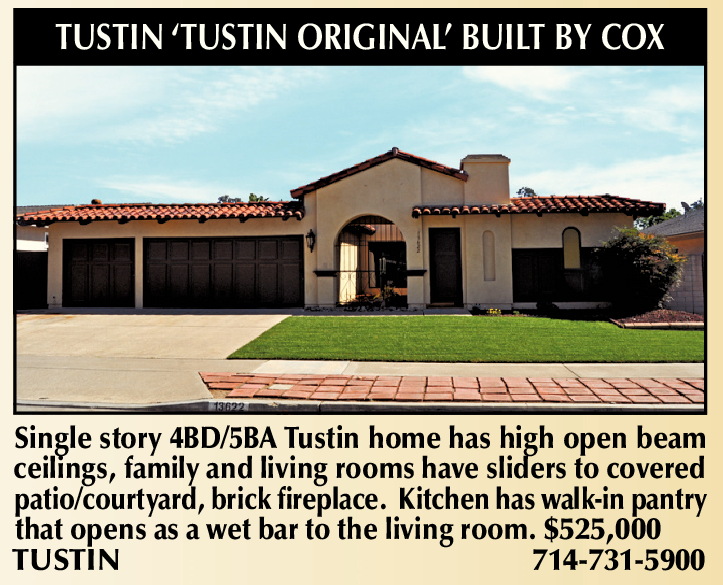 TUSTIN ‘TUSTIN ORIGINAL’ BUILT BY COX Single story 4BD/5BA Tustin home has high open beam ceilings, family and living rooms have sliders to covered patio/courtyard, brick fireplace. Kitchen has walk-in pantry that opens as a wet bar to the living room. $525,000 TUSTIN 714-731-5900