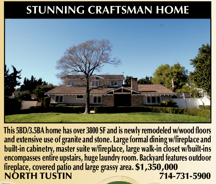 This 5BD/3.5BA home has over 3800 SF and is newly remodeled w/wood floors and extensive use of granite and stone. Large formal dining w/fireplace and built-in cabinetry, master suite w/fireplace, large walk-in closet w/built-ins encompasses entire upstairs, huge laundry room. Backyard features outdoor fireplace, covered patio and large grassy area. $1,350,000 NORTH TUSTIN 714-731-5900