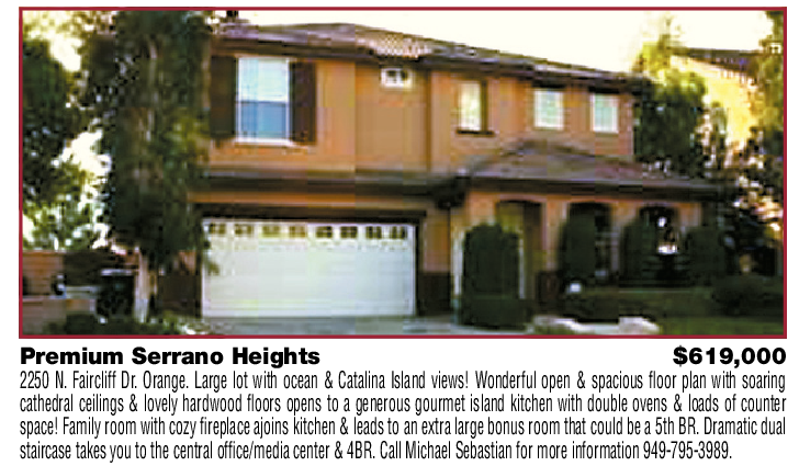 Premium Serrano Heights $619,000 2250 N. Faircliff Dr. Orange. Large lot with ocean & Catalina Island views! Wonderful open & spacious floor plan with soaring cathedral ceilings & lovely hardwood floors opens to a generous gourmet island kitchen with double ovens & loads of counter space! Family room with cozy fireplace ajoins kitchen & leads to an extra large bonus room that could be a 5th BR. Dramatic dual staircase takes you to the central office/media center & 4BR. Call Michael Sebastian for more information 949-795-3989.