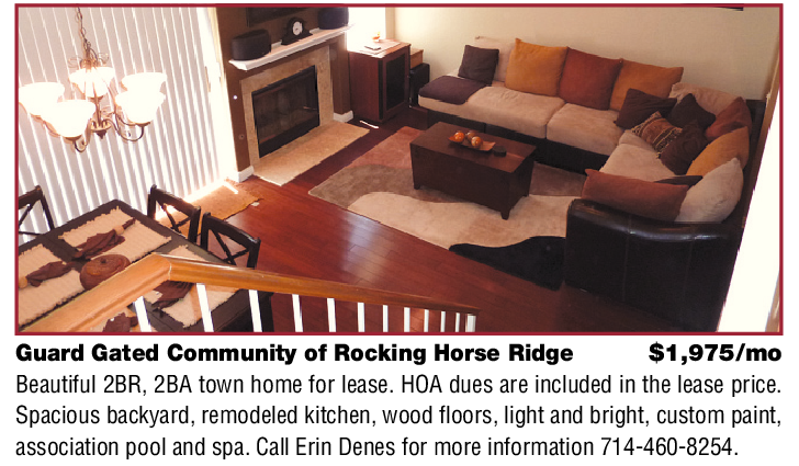 Guard Gated Community of Rocking Horse Ridge $1,975/mo Beautiful 2BR, 2BA town home for lease. HOA dues are included in the lease price. Spacious backyard, remodeled kitchen, wood floors, light and bright, custom paint, association pool and spa. Call Erin Denes for more information 714-460-8254.