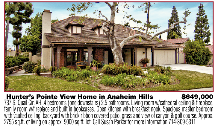 Hunter’s Pointe View Home in Anaheim Hills $649,000 737 S. Quail Cir. AH..4 bedrooms (one downstairs) 2.5 bathrooms. Living room w/cathedral ceiling & fireplace, family room w/fireplace and built in bookcases. Open kitchen with breakfast nook. Spacious master bedroom with vaulted ceiling. backyard with brick ribbon covered patio, grass and view of canyon & golf course. Approx. 2795 sq.ft. of living on approx. 9000 sq.ft. lot. Call Susan Parker for more information 714-809-5311