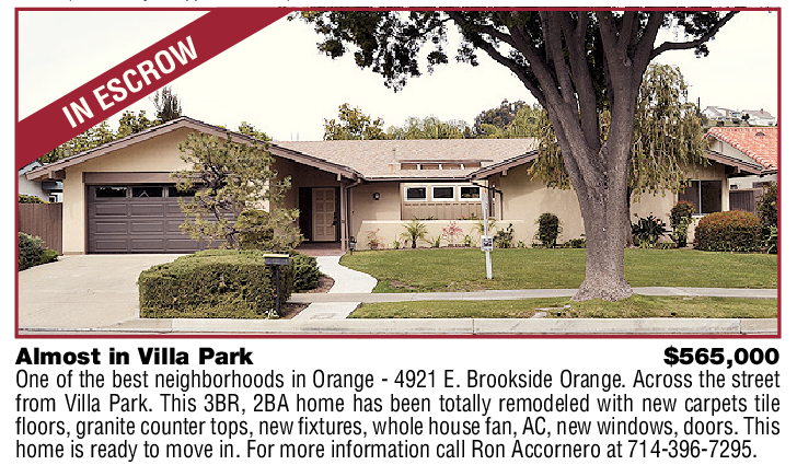 Almost in Villa Park $565,000 One of the best neighborhoods in Orange - 4921 E. Brookside Orange. Across the street from Villa Park. This 3BR, 2BA home has been totally remodeled with new carpets tile floors, granite counter tops, new fixtures, whole house fan, AC, new windows, doors. This home is ready to move in. For more information call Ron Accornero at 714-396-7295.