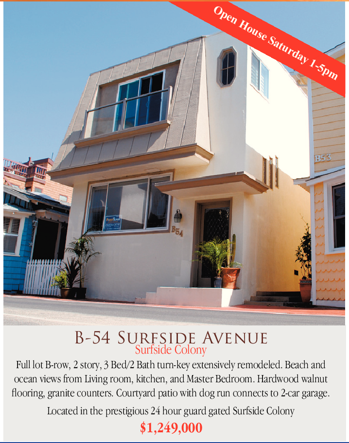 B-54 Surfside Avenue Surfside Colony Full lot B-row, 2 story, 3 Bed/2 Bath turn-key extensively remodeled. Beach and ocean views from Living room, kitchen, and Master Bedroom. Hardwood walnut flooring, granite counters. Courtyard patio with dog run connects to 2-car garage.