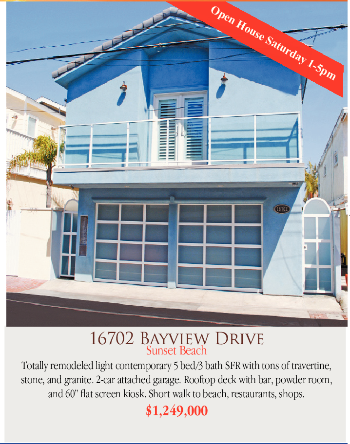 16702 Bayview Drive Sunset Beach Totally remodeled light contemporary 5 bed/3 bath SFR with tons of travertine, stone, and granite. 2-car attached garage. Rooftop deck with bar, powder room, and 60” flat screen kiosk. Short walk to beach, restaurants, shops.