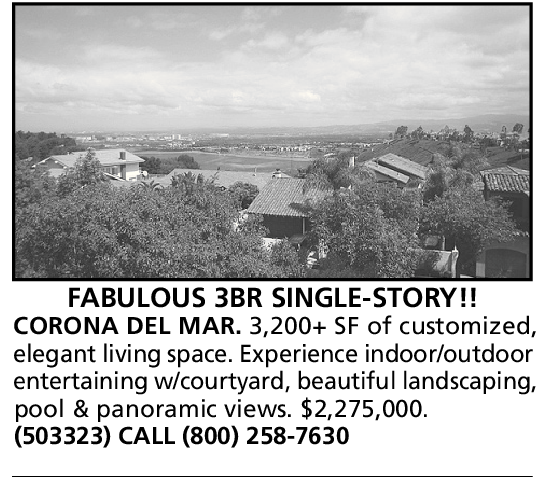 CORONA DEL MAR. 3,200+ SF of customized, elegant living space. Experience indoor/outdoor entertaining w/courtyard, beautiful landscaping, pool & panoramic views. $2,275,000. (503323) CALL (800) 258-7630