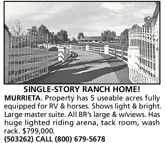 SINGLE-STORY RANCH HOME! MURRIETA. Property has 5 useable acres fully equipped for RV & horses. Shows light & bright. Large master suite. All BR’s large & w/views. Has huge lighted riding arena, tack room, wash rack. $799,000. (503262) CALL (800) 679-5678