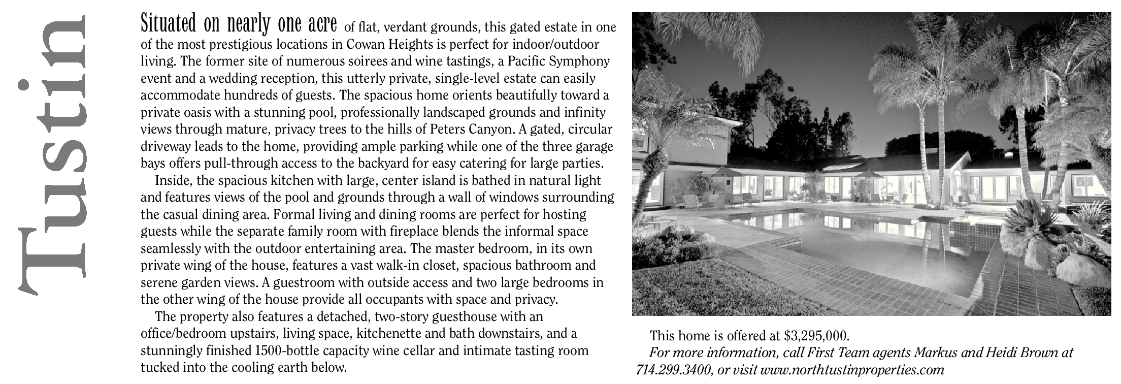 This home is offered at $3,295,000. For more information, call First Team agents Markus and Heidi Brown at 714.299.3400, or visit www.northtustinproperties.com