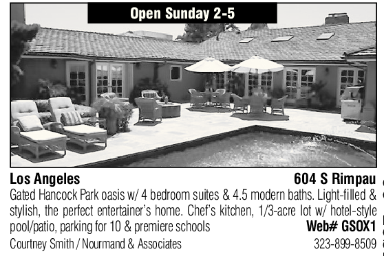 Los Angeles 604 S Rimpau Gated Hancock Park oasis w/ 4 bedroom suites & 4.5 modern baths. Light-filled & stylish, the perfect entertainer’s home. Chef’s kitchen, 1/3-acre lot w/ hotel-style pool/patio, parking for 10 & premiere schools Web# GSOX1 Courtney Smith / Nourmand & Associates 323-899-8509