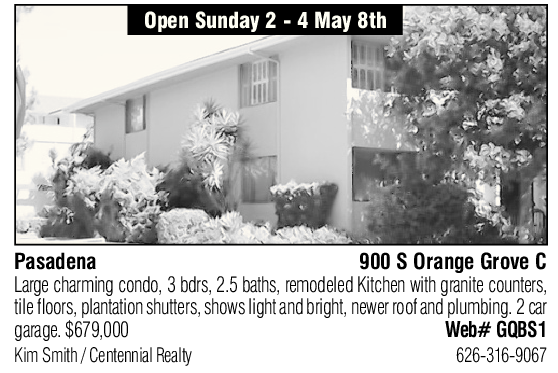 Pasadena 900 S Orange Grove C Large charming condo, 3 bdrs, 2.5 baths, remodeled Kitchen with granite counters, tile floors, plantation shutters, shows light and bright, newer roof and plumbing. 2 car garage. $679,000 Web# GQBS1 Kim Smith / Centennial Realty 626-316-9067