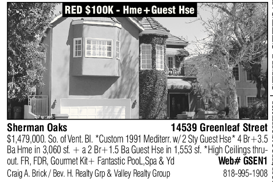 Sherman Oaks 14539 Greenleaf Street $1,479,000. So. of Vent. Bl. *Custom 1991 Mediterr. w/ 2 Sty Guest Hse* 4 Br+3.5 Ba Hme in 3,060 sf.+a2Br+1.5 Ba Guest Hse in 1,553 sf. *High Ceilings thruout. FR, FDR, Gourmet Kit+ Fantastic PooL,Spa & Yd Web# GSEN1 Craig A. Brick / Bev. H. Realty Grp & Valley Realty Group 818-995-1908