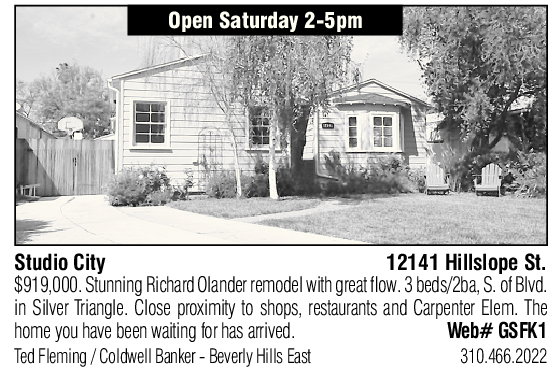 Studio City 12141 Hillslope St. $919,000. Stunning Richard Olander remodel with great flow. 3 beds/2ba, S. of Blvd. in Silver Triangle. Close proximity to shops, restaurants and Carpenter Elem. The home you have been waiting for has arrived. Web# GSFK1 Ted Fleming / Coldwell Banker - Beverly Hills East 310.466.2022