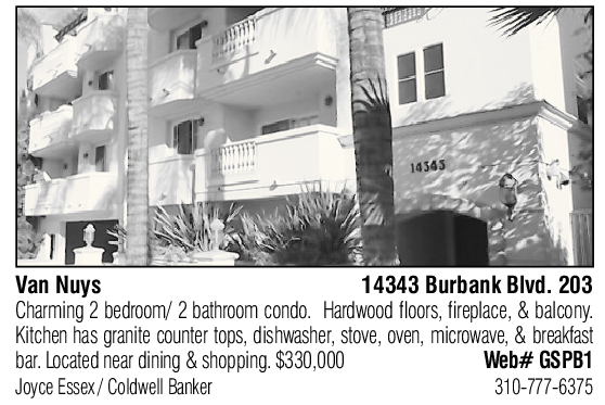 Van Nuys 14343 Burbank Blvd. 203 Charming 2 bedroom/ 2 bathroom condo. Hardwood floors, fireplace, & balcony. Kitchen has granite counter tops, dishwasher, stove, oven, microwave, & breakfast bar. Located near dining & shopping. $330,000 Web# GSPB1 Joyce Essex / Coldwell Banker 310-777-6375