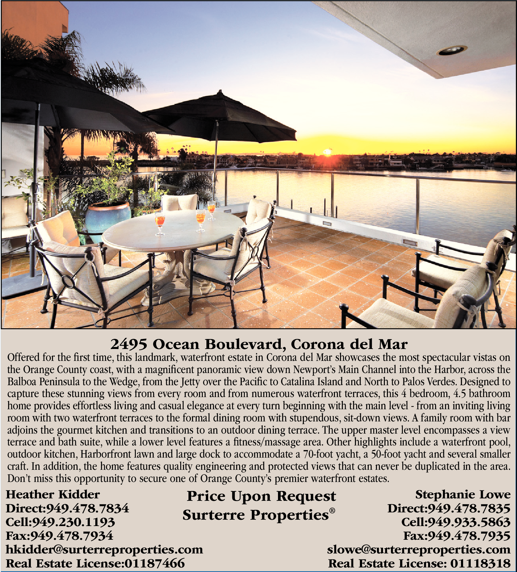 2495 Ocean Boulevard, Corona del Mar Offered for the first time, this landmark, waterfront estate in Corona del Mar showcases the most spectacular vistas on the Orange County coast, with a magnificent panoramic view down Newport’s Main Channel into the Harbor, across the Balboa Peninsula to the Wedge, from the Jetty over the Pacific to Catalina Island and North to Palos Verdes. Designed to capture these stunning views from every room and from numerous waterfront terraces, this 4 bedroom, 4.5 bathroom home provides effortless living and casual elegance at every turn beginning with the main level - from an inviting living room with two waterfront terraces to the formal dining room with stupendous, sit-down views. A family room with bar adjoins the gourmet kitchen and transitions to an outdoor dining terrace. The upper master level encompasses a view terrace and bath suite, while a lower level features a fitness/massage area. Other highlights include a waterfront pool, outdoor kitchen, Harborfront lawn and large dock to accommodate a 70-foot yacht, a 50-foot yacht and several smaller craft. In addition, the home features quality engineering and protected views that can never be duplicated in the area. Don’t miss this opportunity to secure one of Orange County’s premier waterfront estates. Heather Kidder Price Upon Request Direct:949.478.7834 Cell:949.230.1193 Surterre Properties ® Fax:949.478.7934 hkidder@surterreproperties.com Real Estate License:01187466 Stephanie Lowe Direct:949.478.7835 Cell:949.933.5863 Fax:949.478.7935 slowe@surterreproperties.com Real Estate License: 01118318