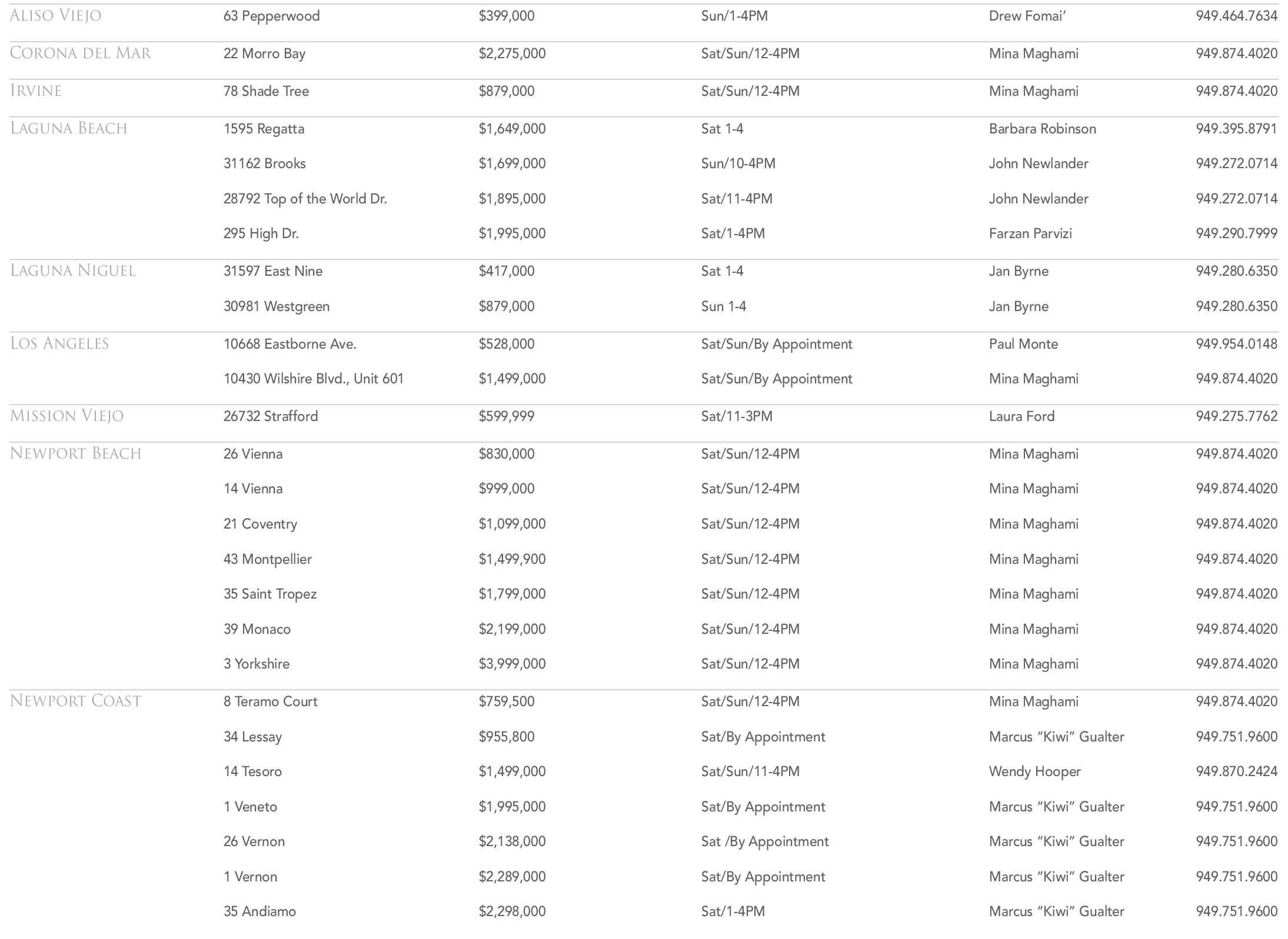 26 Vernon $2,138,000 Sat /By Appointment Marcus “Kiwi” Gualter 949.751.9600