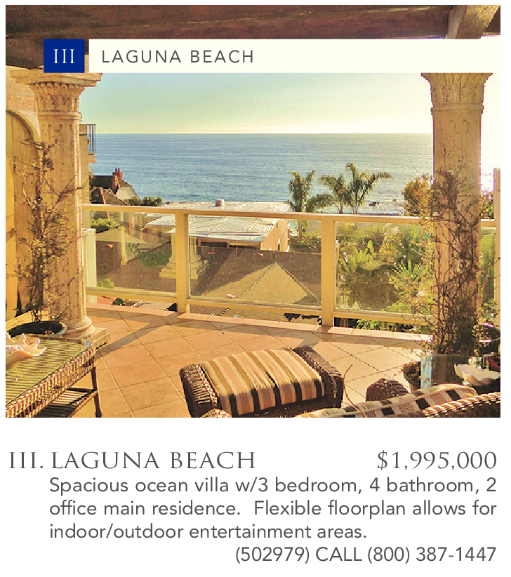 III. LAGUNA BEACH $1,995,000 Spacious ocean villa w/3 bedroom, 4 bathroom, 2 office main residence. Flexible floorplan allows for indoor/outdoor entertainment areas.