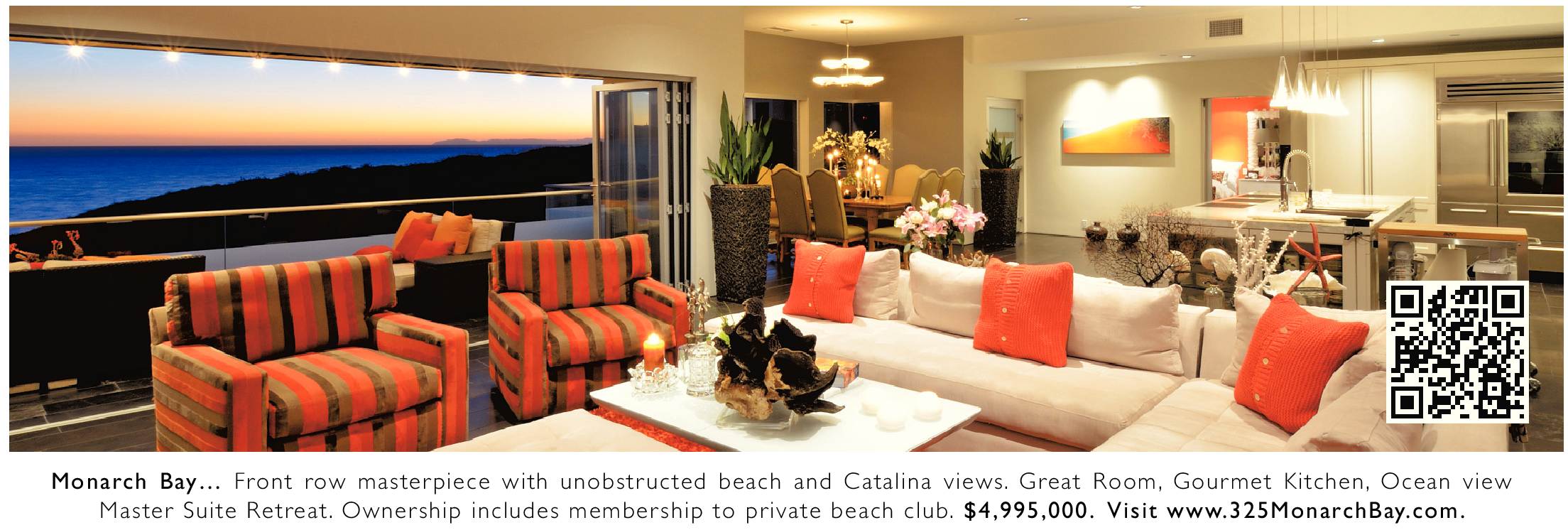 Monarch Bay… Front row masterpiece with unobstructed beach and Catalina views. Great Room, Gourmet Kitchen, Ocean view Master Suite Retreat. Ownership includes membership to private beach club. $4,995,000. Visit www.325MonarchBay.com.