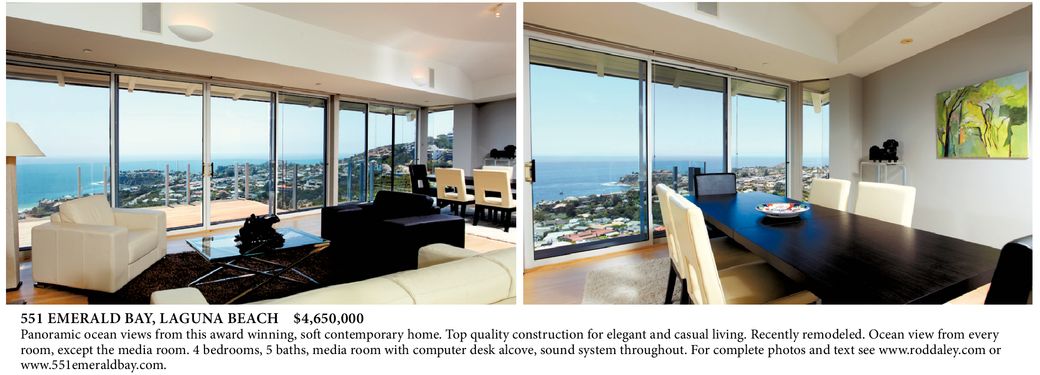 551 EMERALD BAY, LAGUNA BEACH $4,650,000 Panoramic ocean views from this award winning, soft contemporary home. Top quality construction for elegant and casual living. Recently remodeled. Ocean view from every room, except the media room. 4 bedrooms, 5 baths, media room with computer desk alcove, sound system throughout. For complete photos and text see www.roddaley.com or www.551emeraldbay.com.