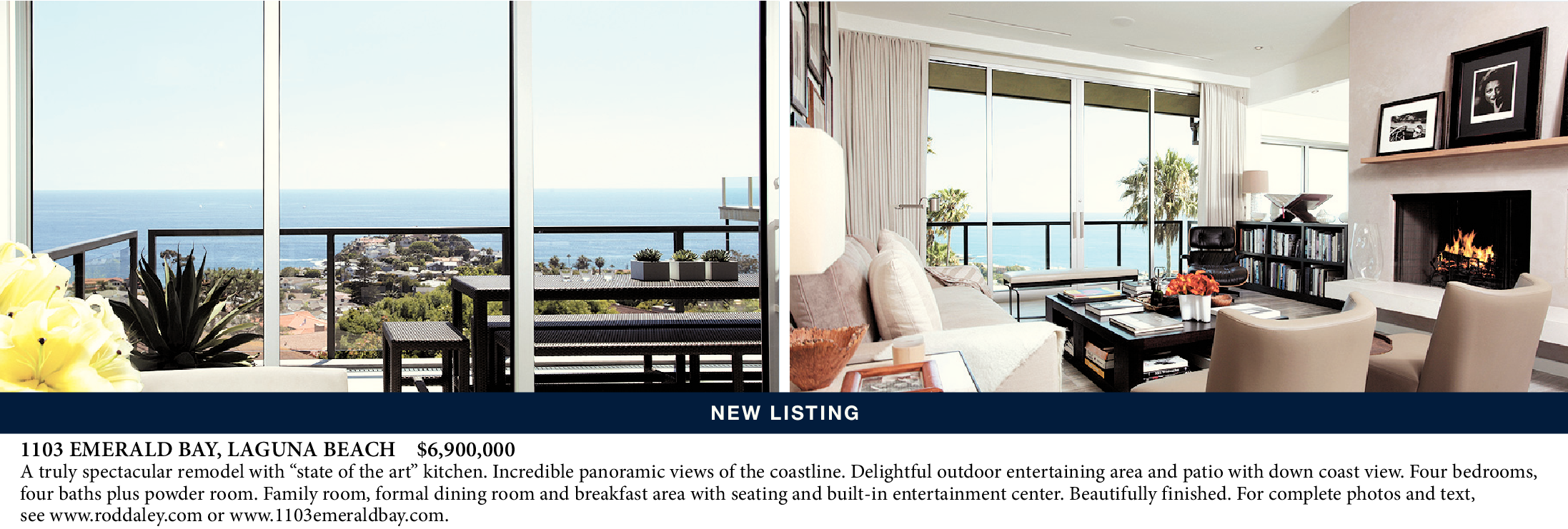 1103 EMERALD BAY, LAGUNA BEACH $6,900,000 A truly spectacular remodel with “state of the art” kitchen. Incredible panoramic views of the coastline. Delightful outdoor entertaining area and patio with down coast view. Four bedrooms, four baths plus powder room. Family room, formal dining room and breakfast area with seating and built-in entertainment center. Beautifully finished. For complete photos and text, see www.roddaley.com or www.1103emeraldbay.com. NEW LISTING