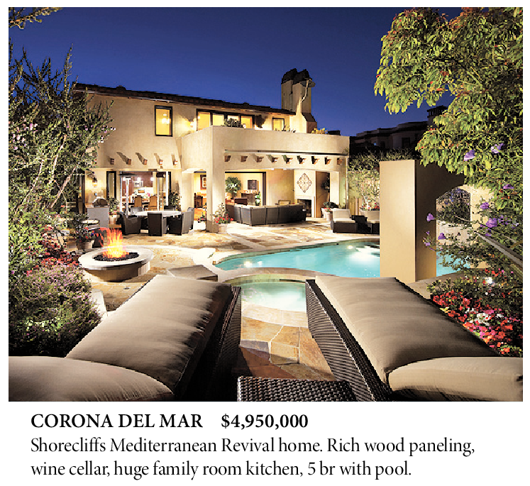 CORONA DEL MAR $4,950,000 Shorecliffs Mediterranean Revival home. Rich wood paneling, wine cellar, huge family room kitchen, 5 br with pool.