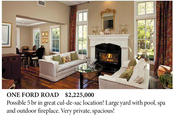ONE FORD ROAD $2,225,000 Possible 5 br in great cul-de-sac location! Large yard with pool, spa and outdoor fireplace. Very private, spacious!