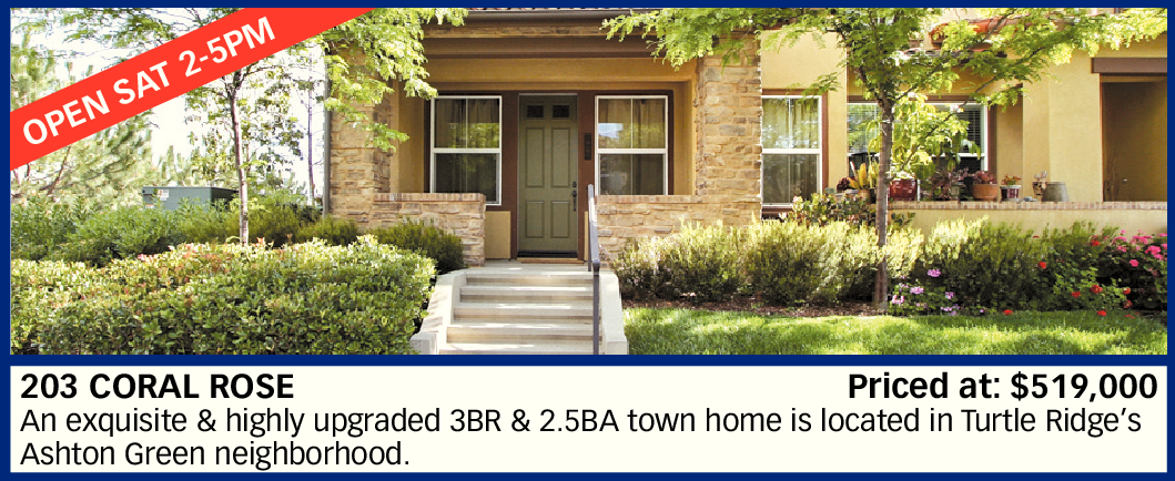 203 CORAL ROSE Priced at: $519,000 An exquisite & highly upgraded 3BR & 2.5BA town home is located in Turtle Ridge’s Ashton Green neighborhood.