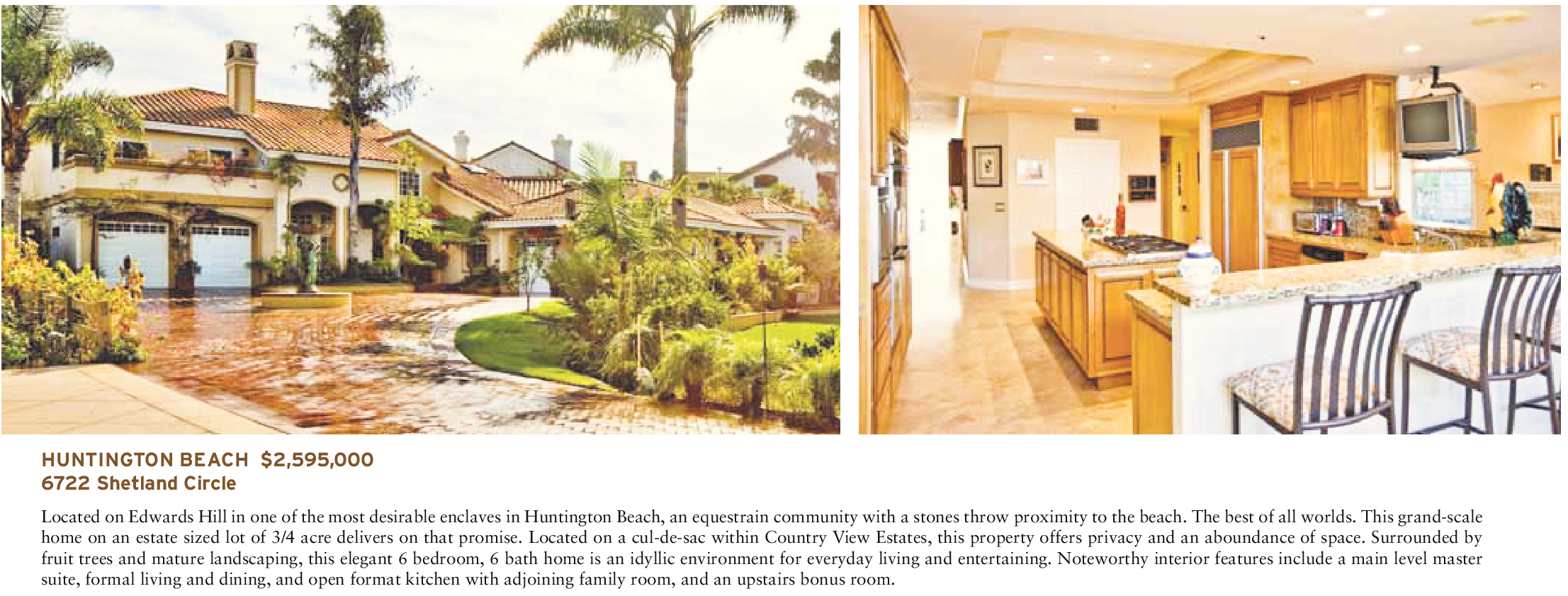 HUNTINGTON BEACH $2,595,000 6722 Shetland Circle Located on Edwards Hill in one of the most desirable enclaves in Huntington Beach, an equestrain community with a stones throw proximity to the beach. The best of all worlds. This grand-scale home on an estate sized lot of 3/4 acre delivers on that promise. Located on a cul-de-sac within Country View Estates, this property offers privacy and an aboundance of space. Surrounded by fruit trees and mature landscaping, this elegant 6 bedroom, 6 bath home is an idyllic environment for everyday living and entertaining. Noteworthy interior features include a main level master suite, formal living and dining, and open format kitchen with adjoining family room, and an upstairs bonus room.