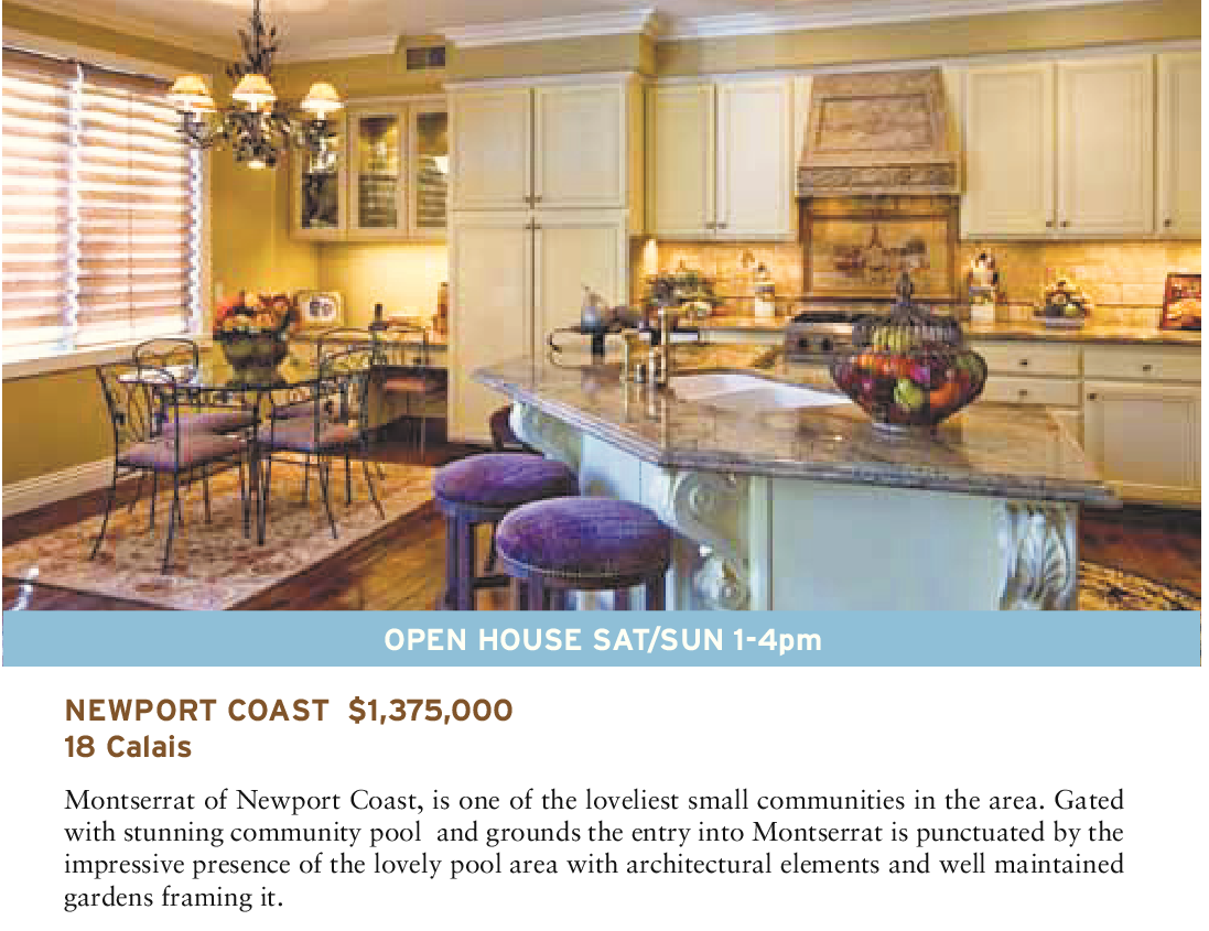NEWPORT COAST $1,375,000 18 Calais OPEN HOUSE SAT/SUN 1-4pm Montserrat of Newport Coast, is one of the loveliest small communities in the area. Gated with stunning community pool and grounds the entry into Montserrat is punctuated by the impressive presence of the lovely pool area with architectural elements and well maintained gardens framing it.
